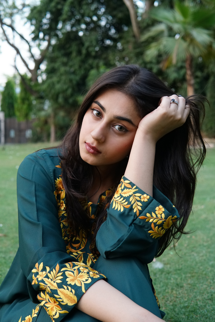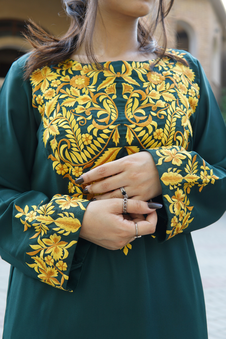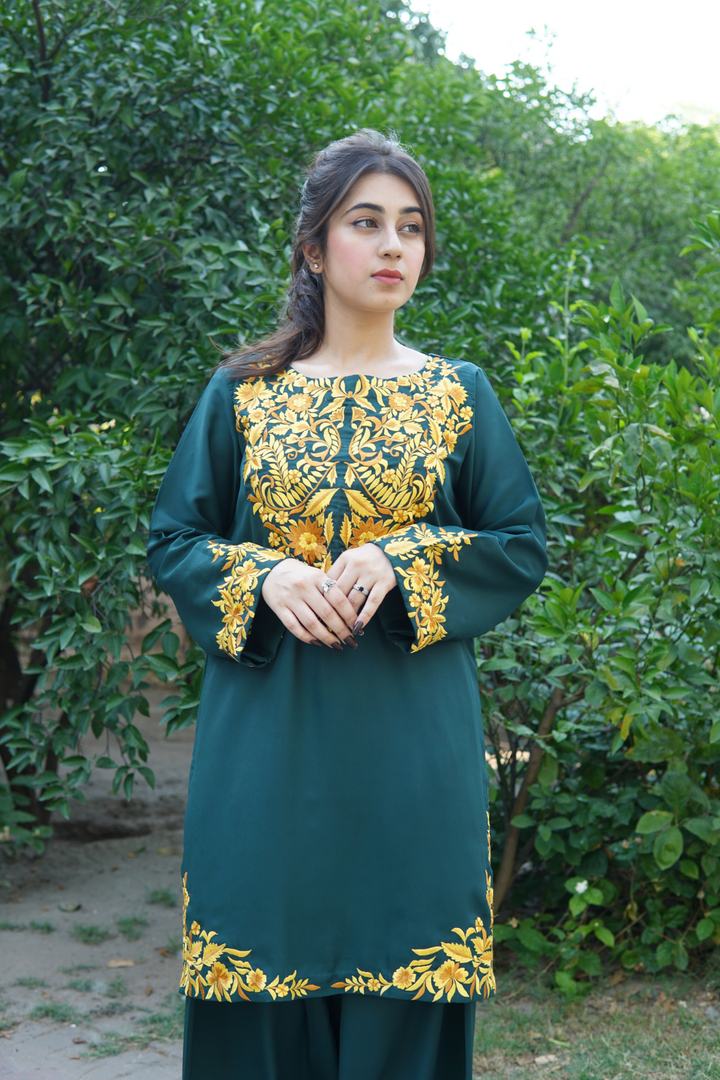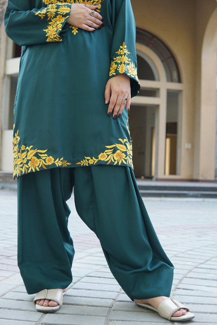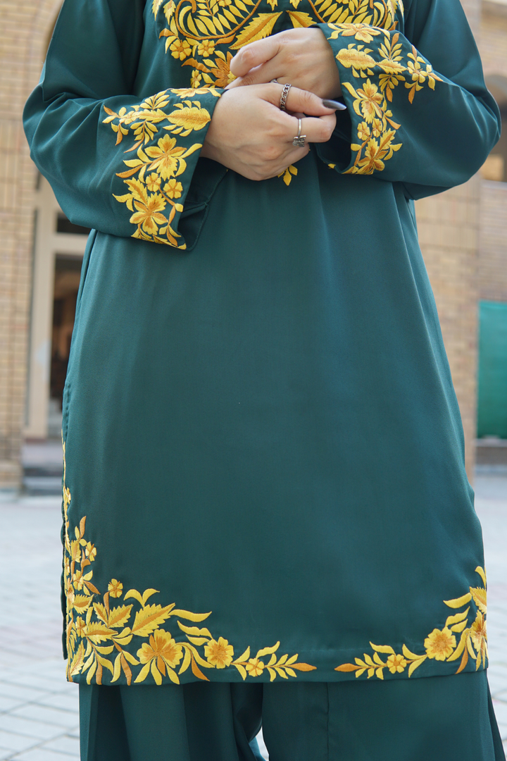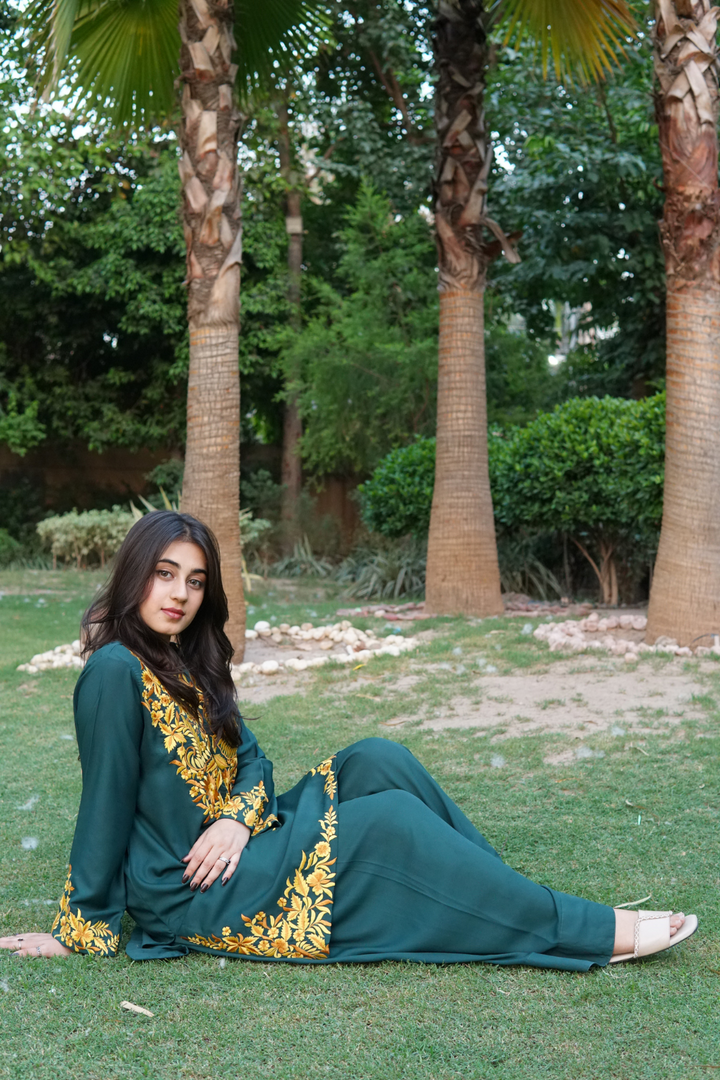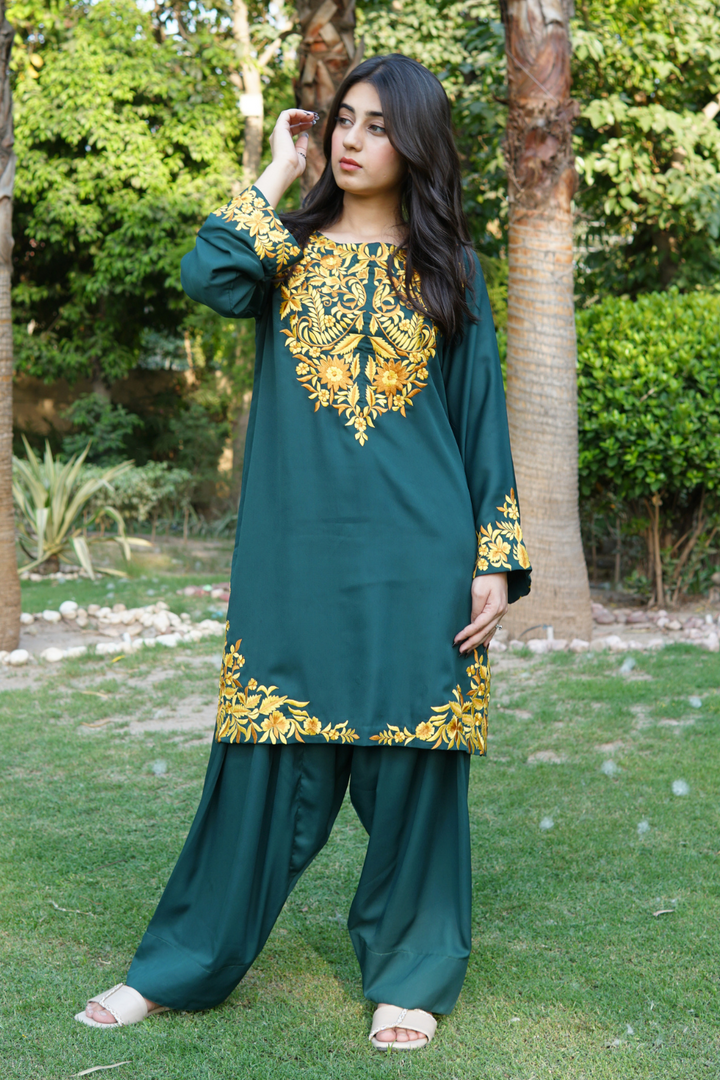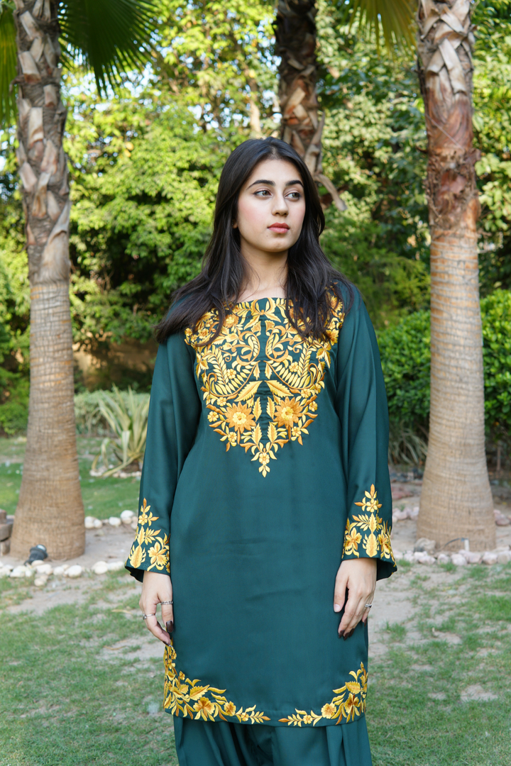 A dark green embroidered shirt paired with matching farshi shalwar made from premium Grip fabric — perfect for seasonal occasions.