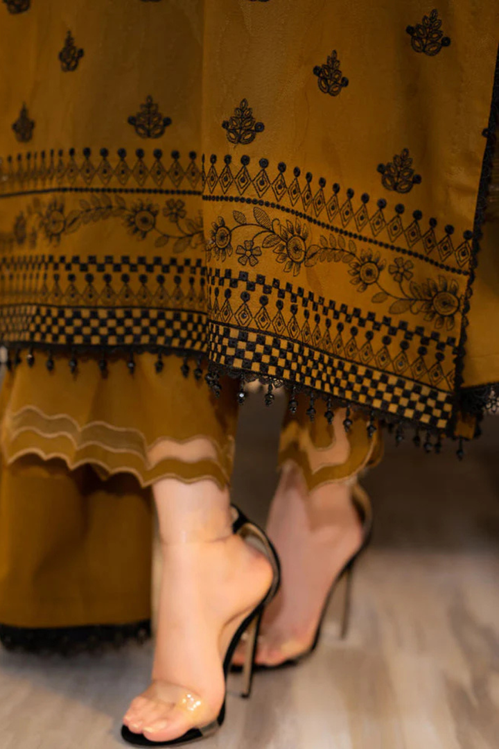 Abroo | Embroidered 3-Piece — a graceful misty brown outfit crafted from premium stone linen. It features a long embroidered shirt with delicate lace work, paired with a lace-detailed trouser and a matching stone linen dupatta.
