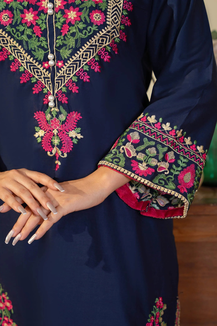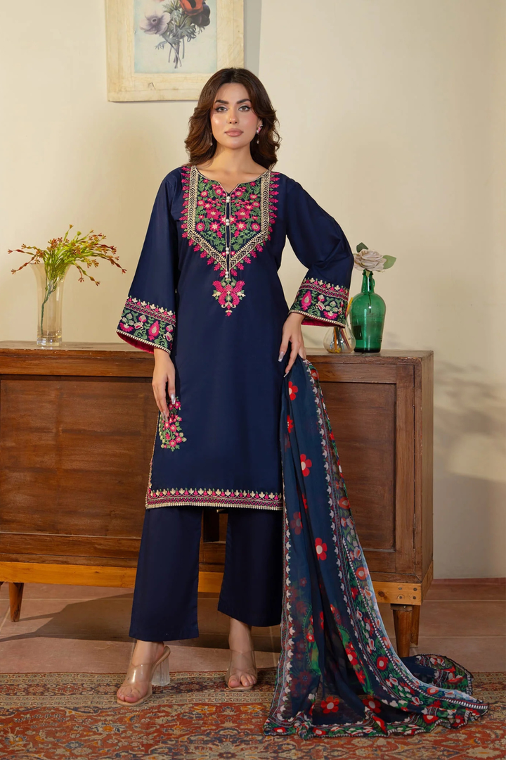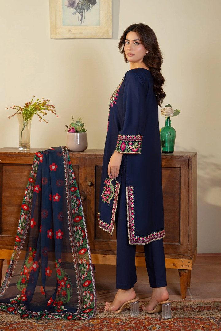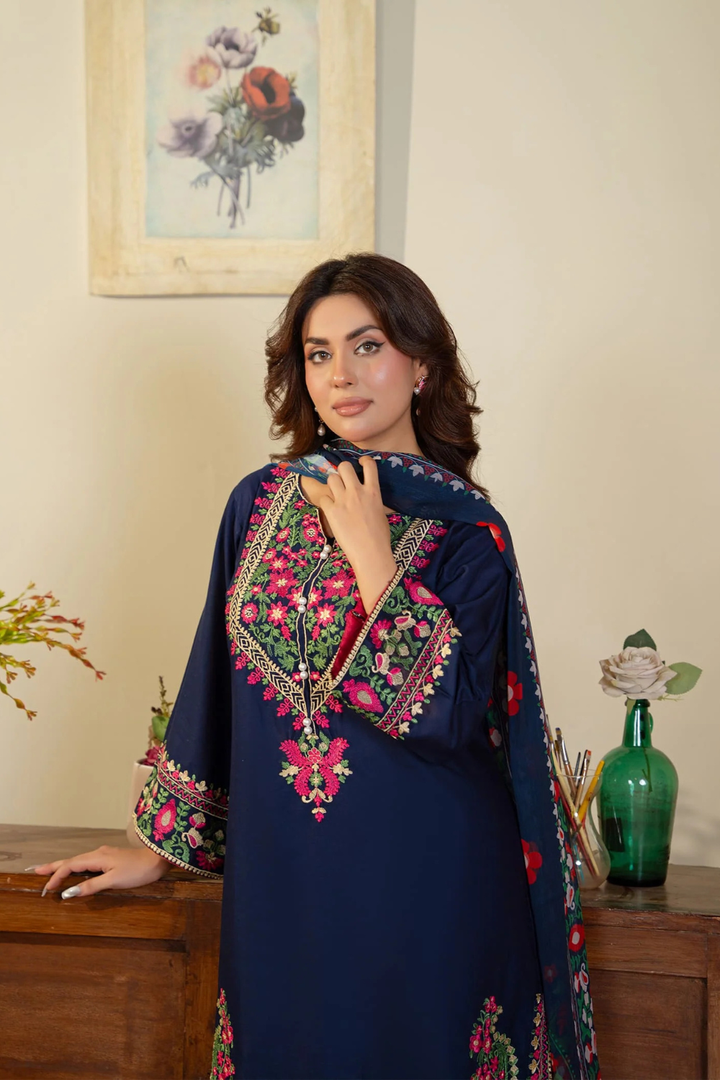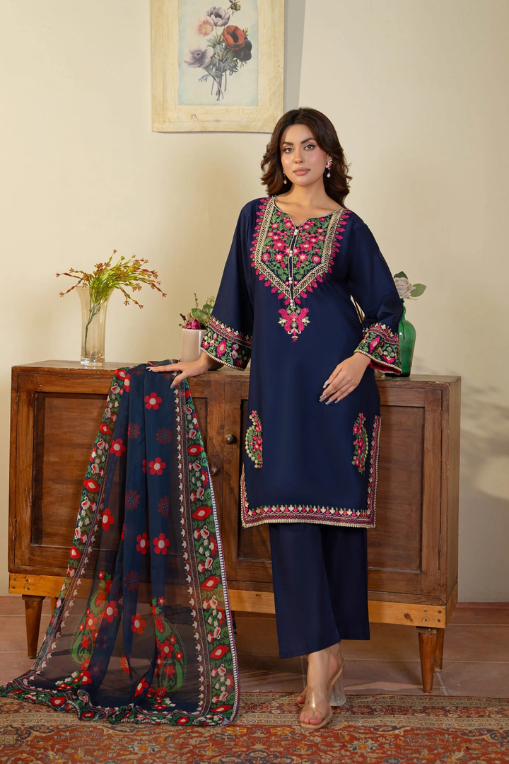 Embroidered 3-Piece — a stunning outfit made from premium stone linen. It features an embroidered shirt, a plain trouser, and an organza embroidered dupatta that adds a touch of elegance to your festive look.