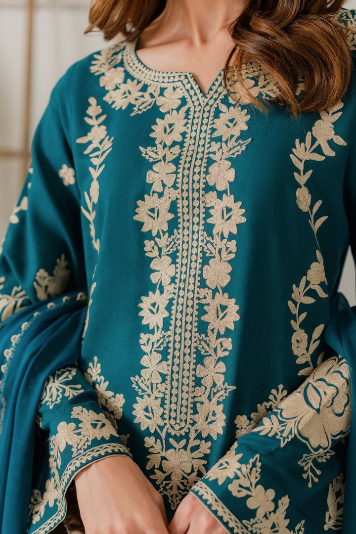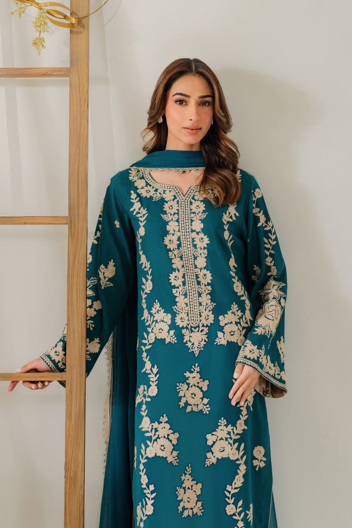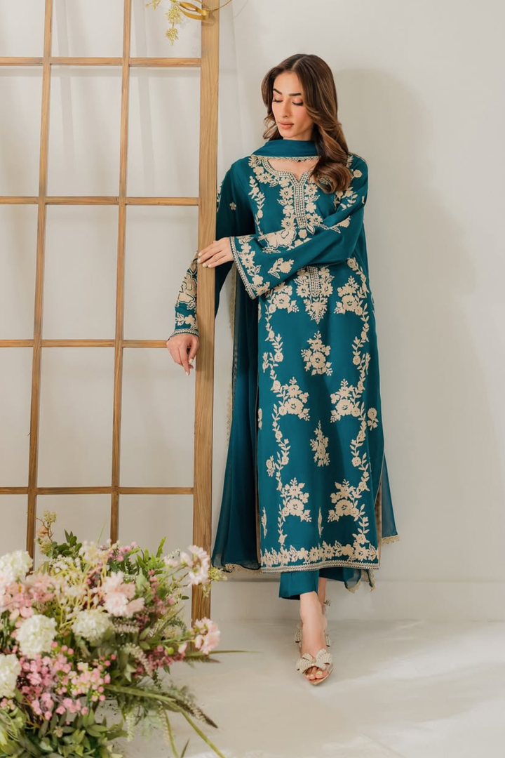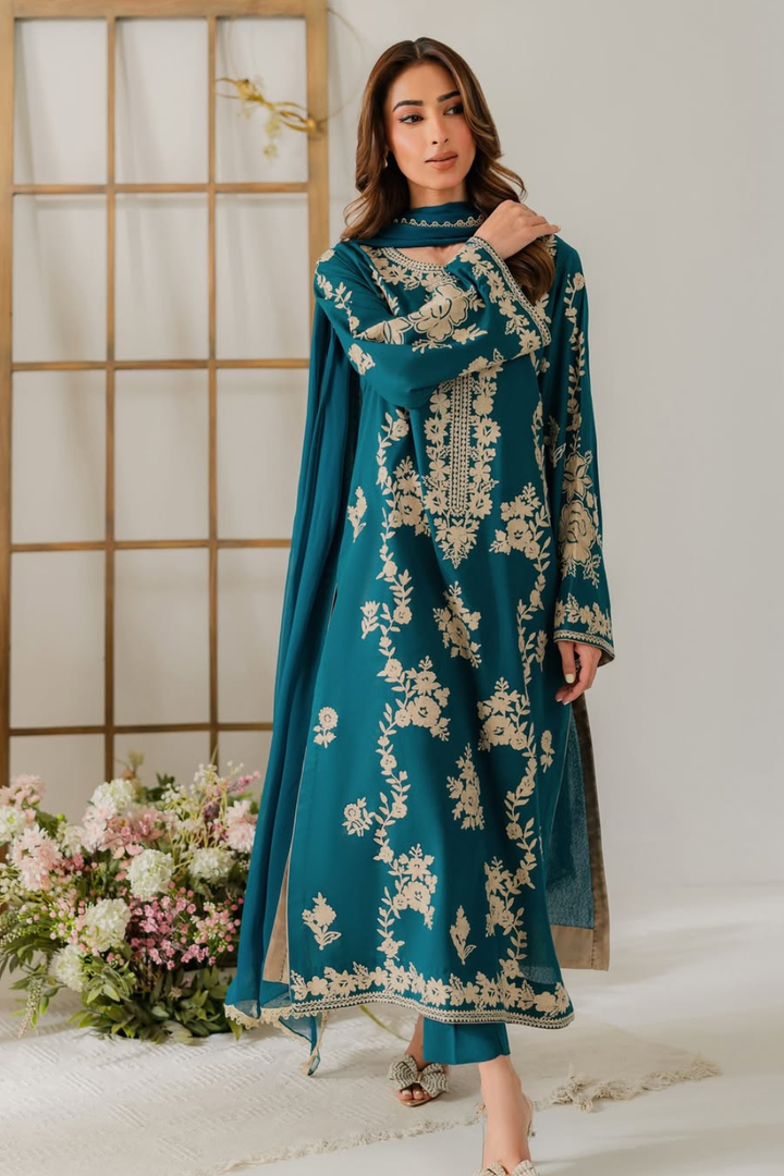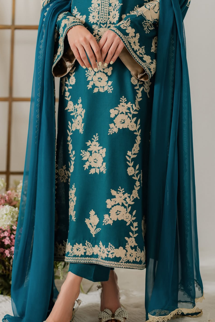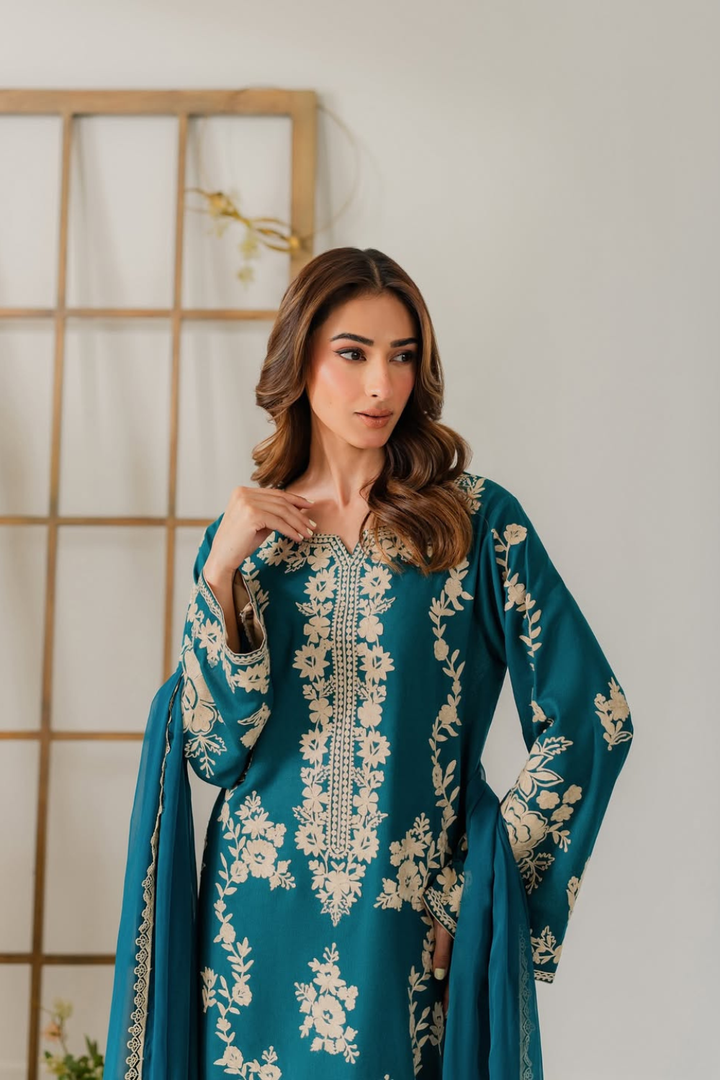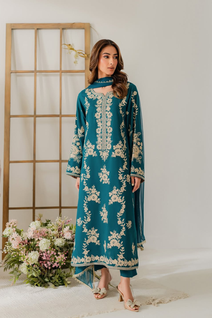 Blush | 3-Piece — a graceful zinc-toned outfit in stone linen. It features a long embroidered shirt with fine detailing, a plain trouser, and a plain organza dupatta for a soft, elegant look.
