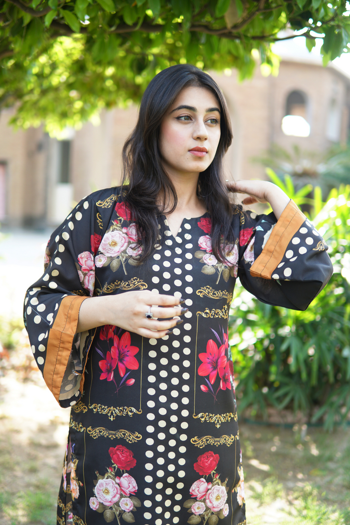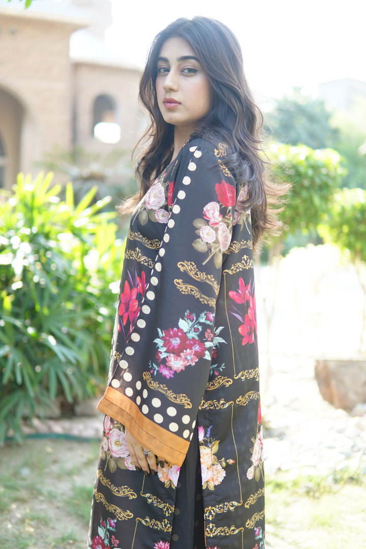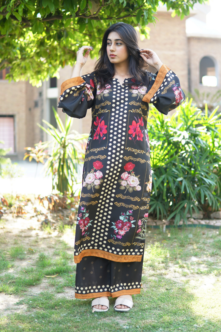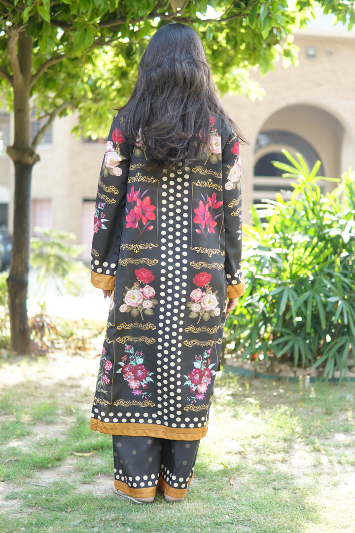 A stylish black printed shirt paired with matching trouser, crafted from breathable slub lawn for casual and formal comfort.