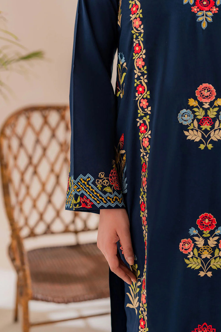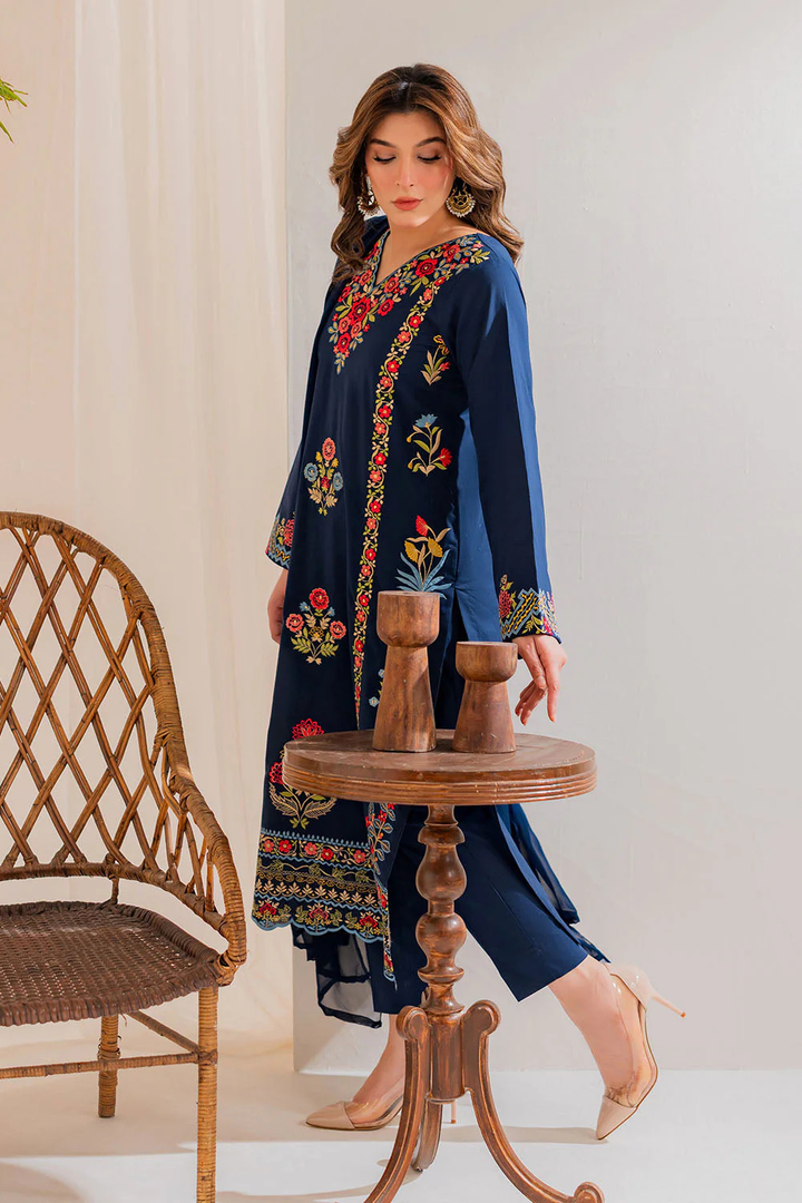 Grace Blue 3-Piece — made in soft dhanak fabric for winter comfort. The embroidered shirt adds a stylish touch, paired with a simple trouser and a chiffon dupatta for an elegant finish.