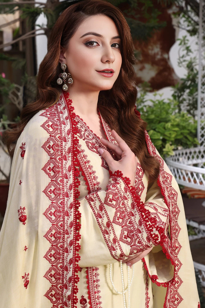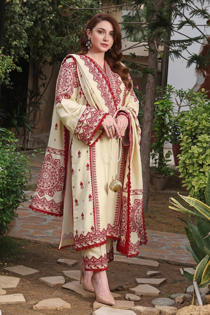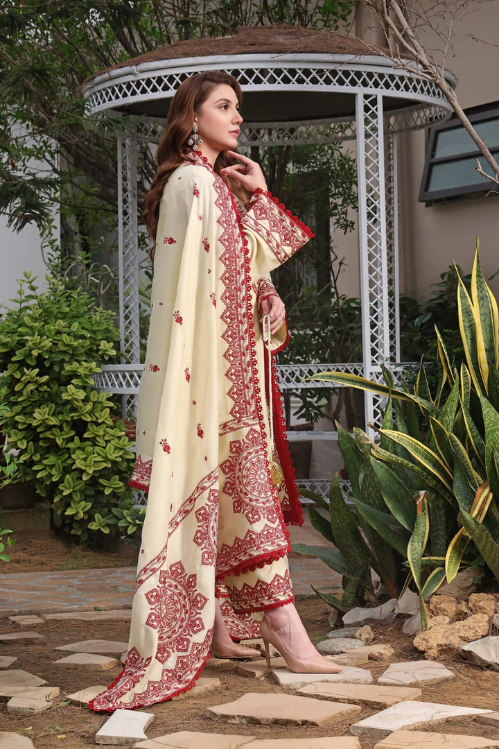 Gul-e-Khaas | Embroidered 3-Piece — a stunning off-white outfit crafted from premium Dhanak fabric. This elegant set features a fully embroidered shirt, embroidered trouser, and embroidered dupatta for a refined festive appeal.