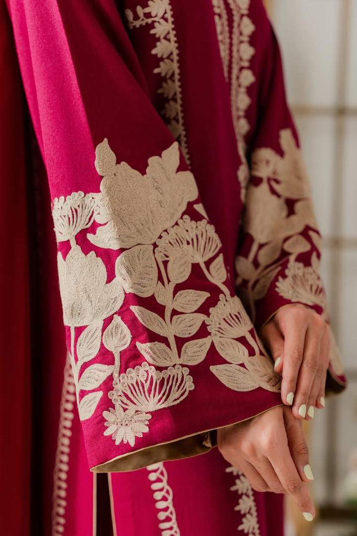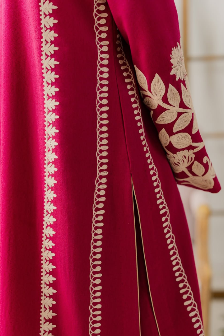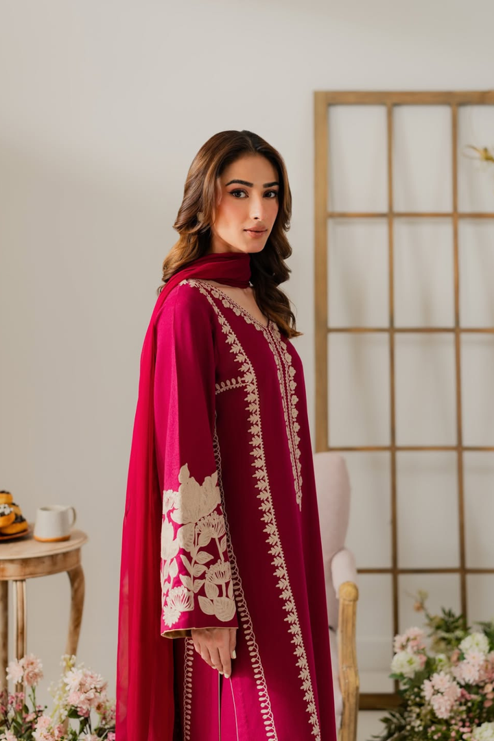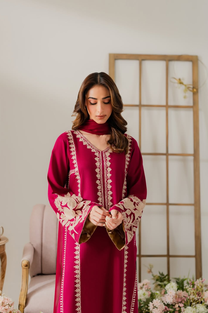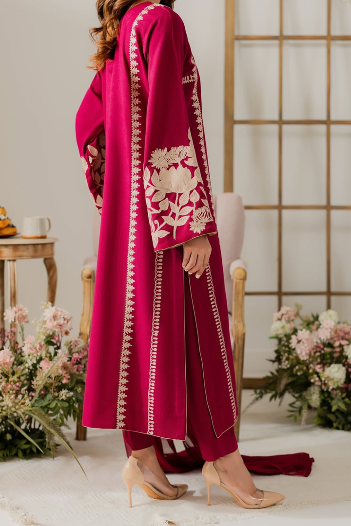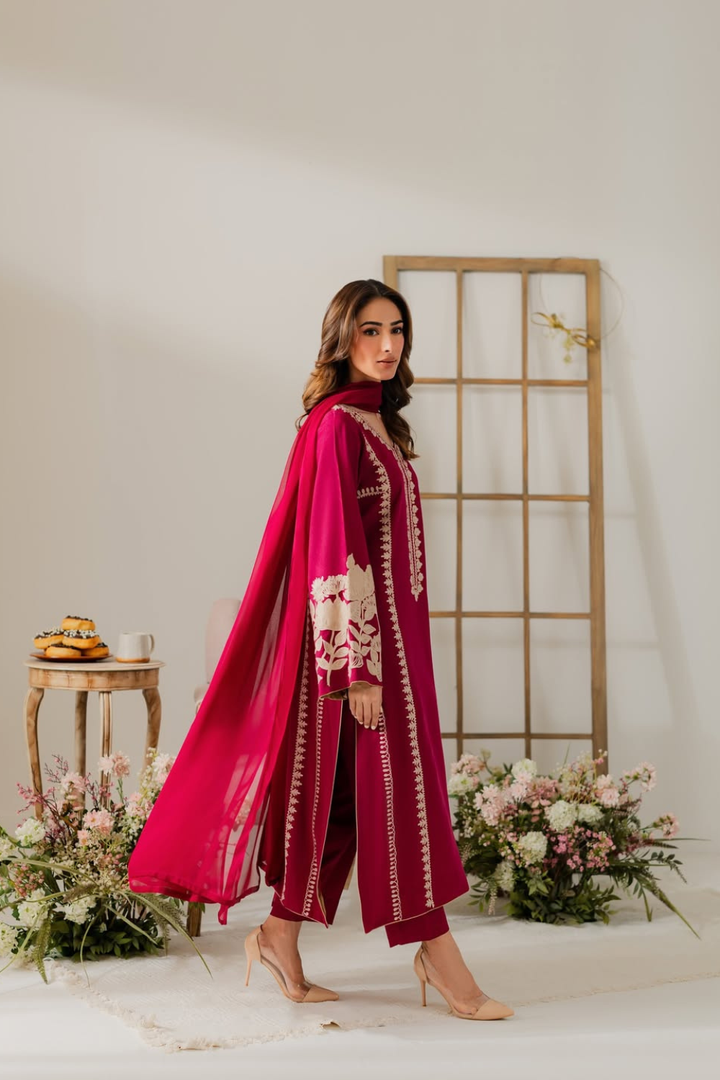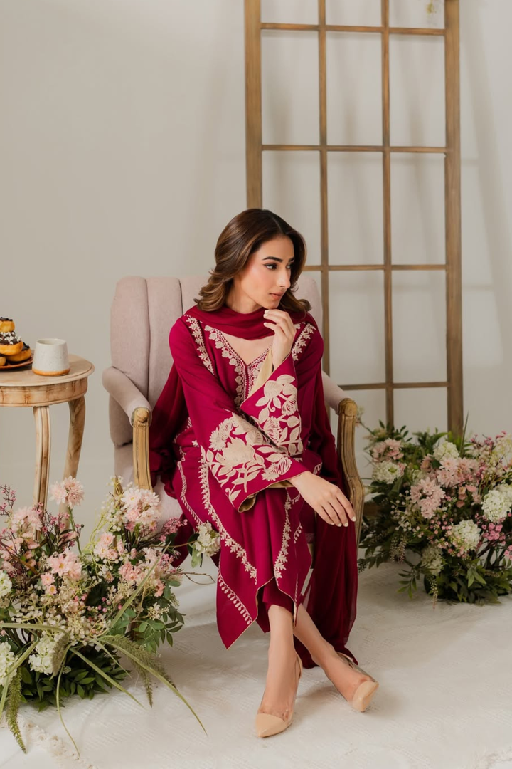 Laali | Embroidered 3-Piece — a timeless maroon outfit crafted in premium stone linen. The long embroidered shirt features 100% neat and detailed threadwork that exudes quality and elegance. Paired with a plain trouser and a light organza dupatta, this set is perfect for festive and formal wear.
