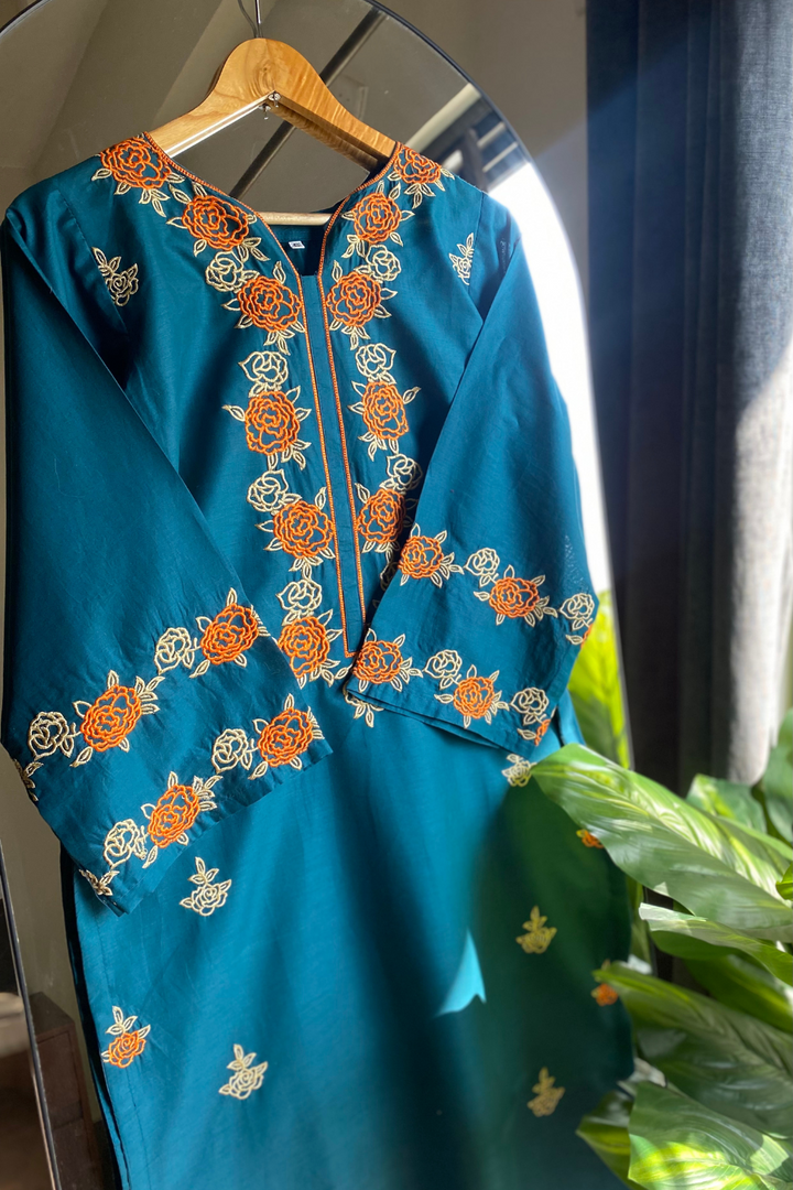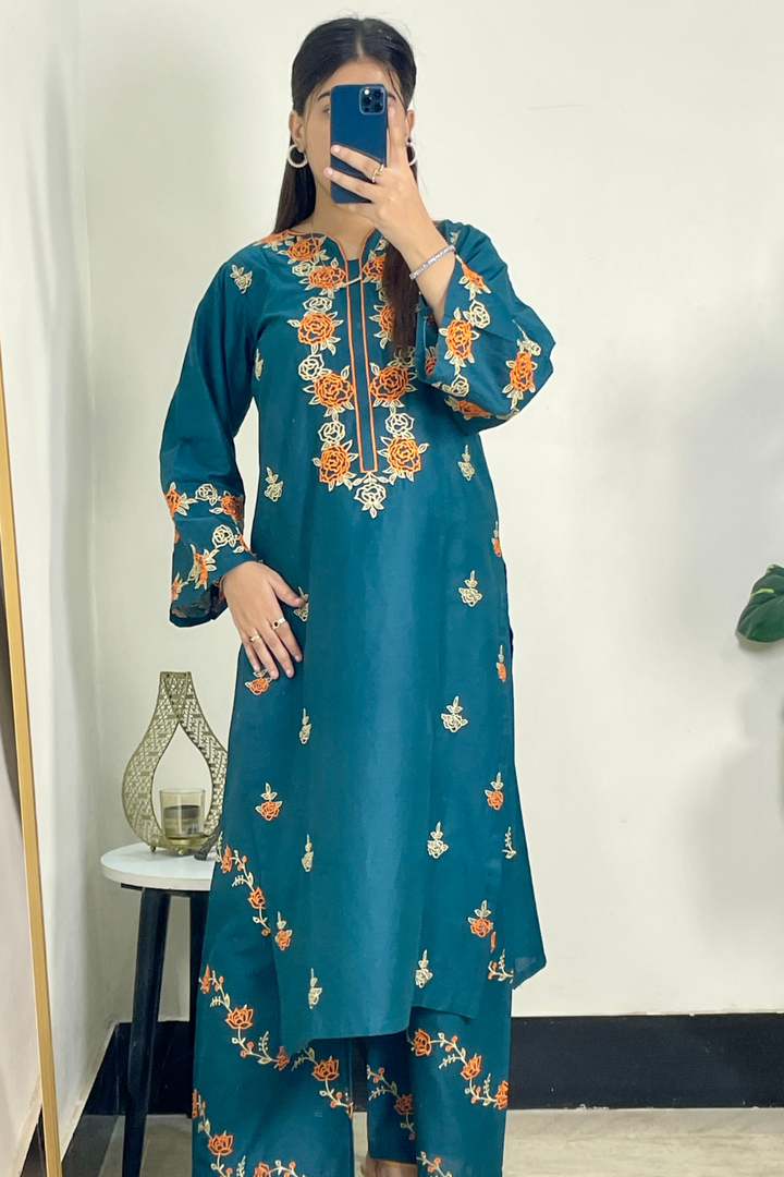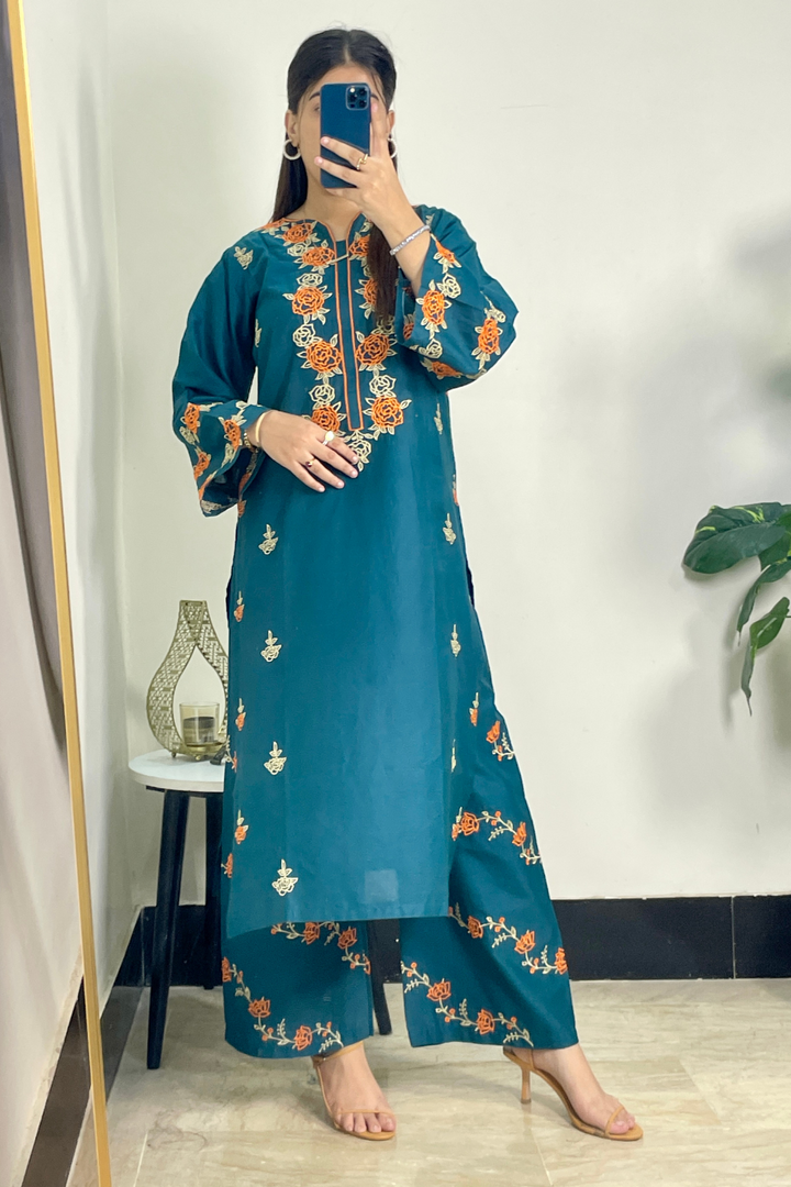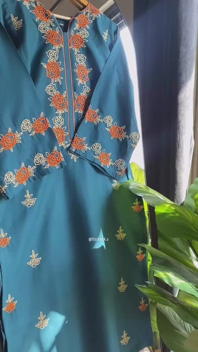 Crafted from soft cotton both the straight cut shirt and matching trouser are fully embroidered creating a graceful and standout look