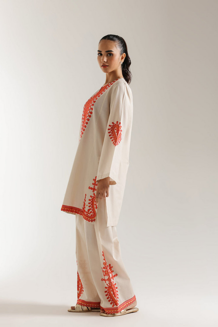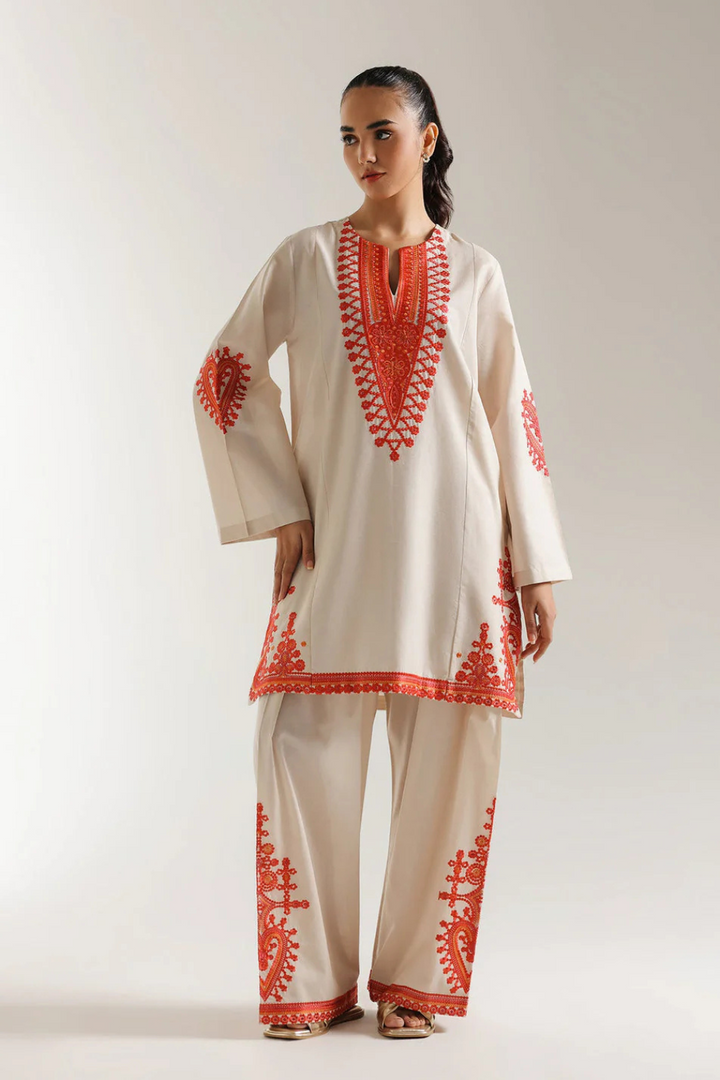 Meet Zoya — your new favorite white outfit! This gorgeous 2PC set features stunning orange embroidery design, elegant round neckline, full sleeves, and matching trouser. Perfect for looking amazing anywhere you go!